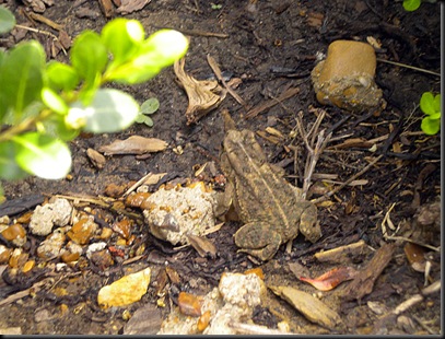 Of course, a toad had to join the picture. We have toads all over our yard. When I mow the lawn, I find about two or three every time on the side of the fence jumping away from the mower. At night when I go jogging or for a walk, there are always a few on the sidewalk collecting the heat from the concrete.